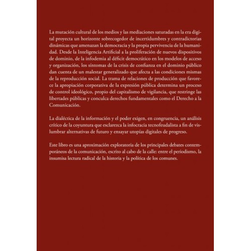 La mutación cultural de los medios y las mediaciones saturadas en la era digital proyecta un horizonte sobrecogedor de incertidumbres y contradictorias dinámicas que amenazan la democracia y la propia pervivencia de la humanidad. Desde la Inteligencia Artificial a la proliferación de nuevos dispositivos de dominio, de la infodemia al déficit democrático en los modelos de acceso y organización, los síntomas de la crisis de confianza en el dominio público dan cuenta de un malestar generalizado que afecta a las condiciones mismas de la reproducción social. La trama de relaciones de producción que favorece la apropiación corporativa de la expresión pública determina un proceso de control ideológico, propio del capitalismo de vigilancia, que restringe las libertades públicas y conculca derechos fundamentales como el Derecho a la Comunicación.