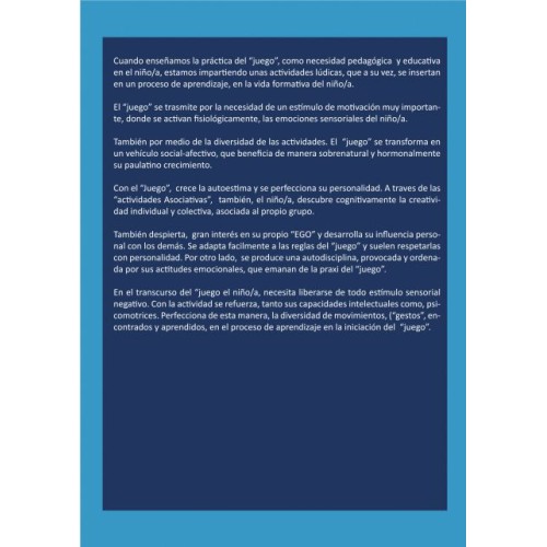 En el transcurso del "juego el niño/a, necesita liberarse de todo estímulo sensorial negativo. Con la actividad se refuerza, tanto sus capacidades intelectuales como, psicomotrices. Perfecciona de esta manera, la diversidad de movimientos, ("gestos", encontrados y aprendidos, en el proceso de aprendizaje en la iniciación del "juego".